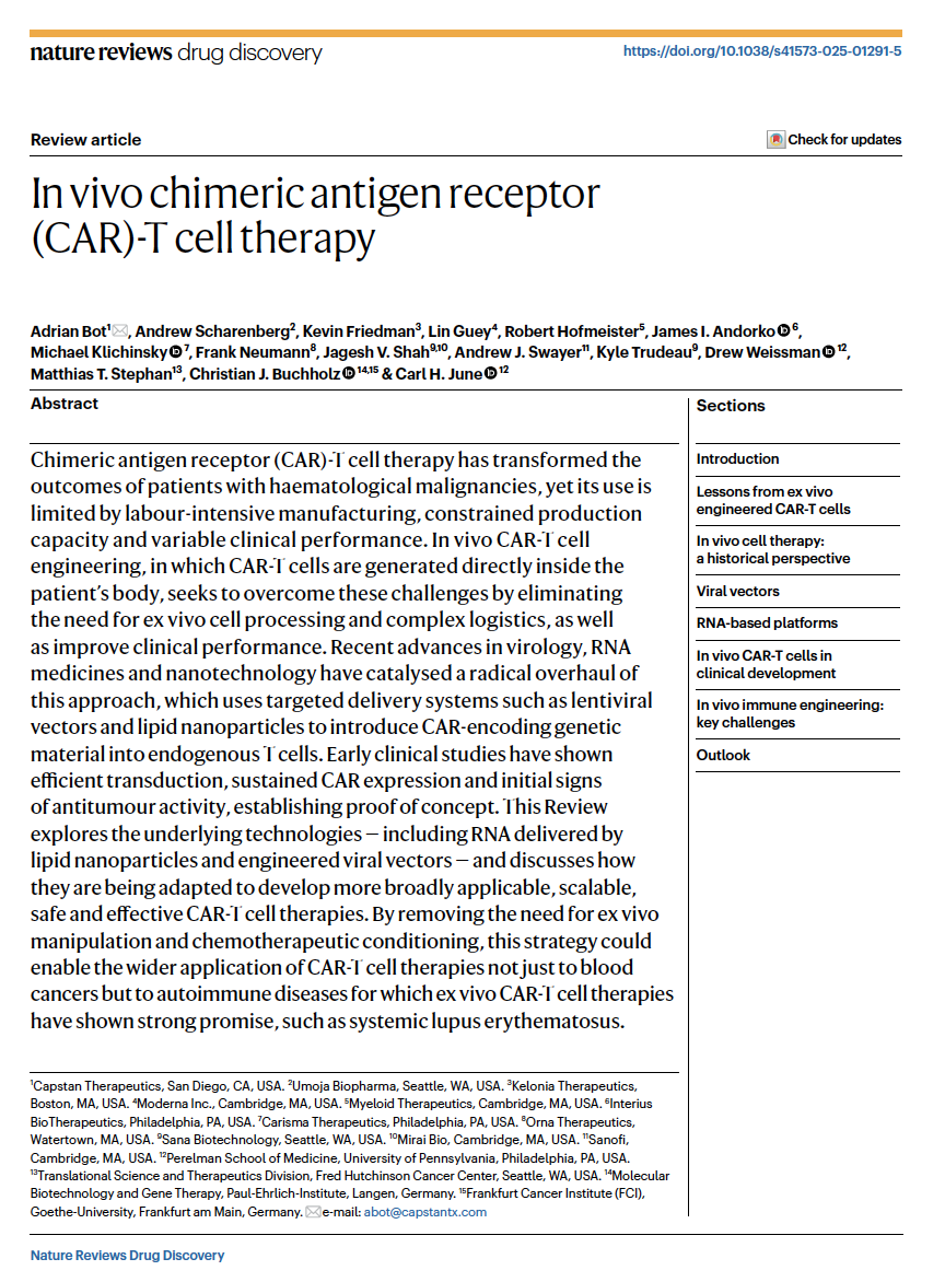 Howell F. Moffett, Michael E. Coon, Stefan Radtke, Sirkka B. Stephan, Laura McKnight. Abigail Lambert, Barry L. Stoddard, Hans-Peter Kiem & Matthias T. Stephan. Hit-and-run programming of therapeutic cytoreagents using mRNA nanocarriers. Nature Communications. 8, Article number: 389 (2017).